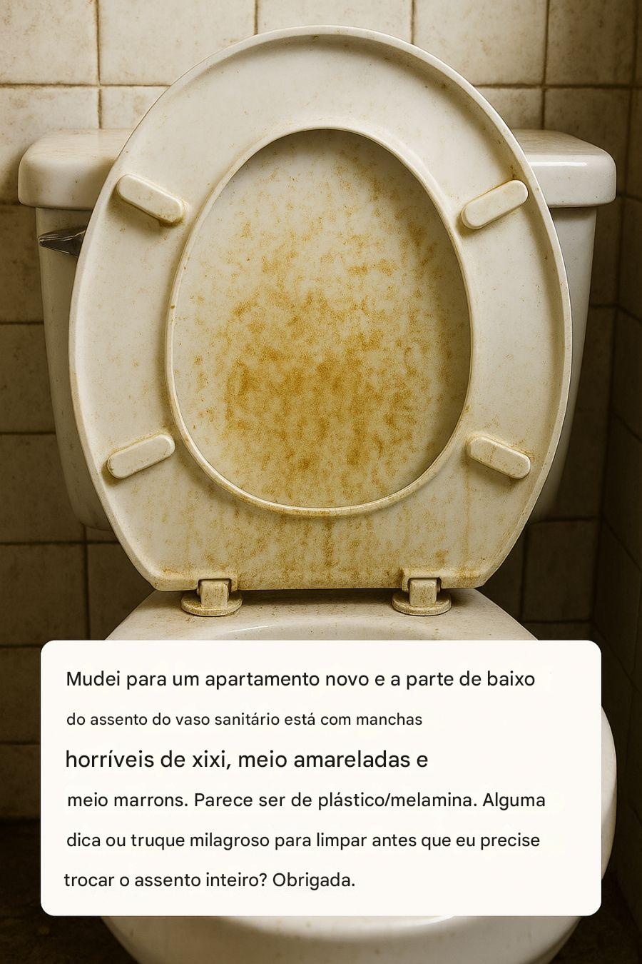 Mudei para um apartamento novo e a parte de baixo do assento do vaso sanitário está com manchas horríveis de xixi, meio amareladas e meio marrons. Parece ser de plástico/melamina. Alguma dica ou produto de limpeza milagroso antes que eu precise trocar o assento inteiro? Obrigada!